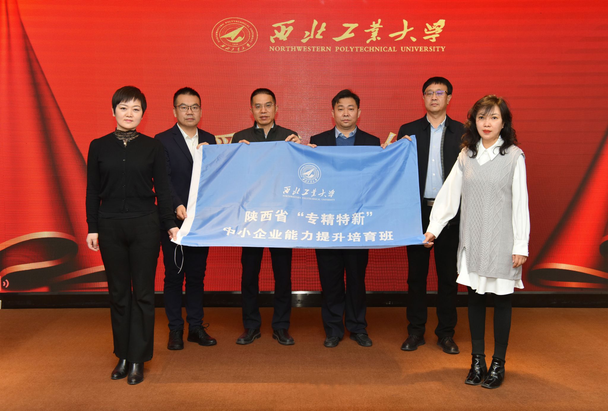 为更好的传承“专精特新”培训的精神和文化,发扬西工大“三实一新”校风,仪式上还进行了授班旗和为学员代表佩戴西工大校徽的环节,班主任和学员代表接受了班旗,通过班旗聚情传谊。