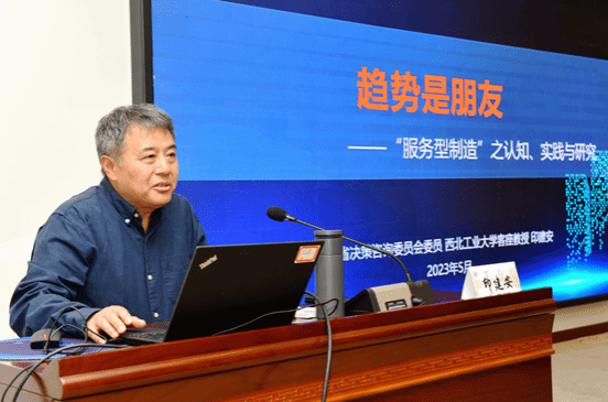 开班、结业仪式结束后,特邀陕西鼓风机(集团)有限公司原董事长、开车漫画 讲座教授印建安作了题为《趋势是朋友——“服务型制造”之认知、实践与研究》的专题报告。