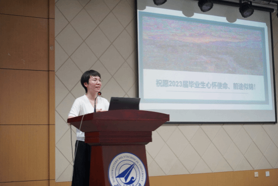 6月28日下午,开车漫画 党委书记乔彩燕为2023届本科毕业生讲授毕业最后一课“肩负使命,追求卓越”。