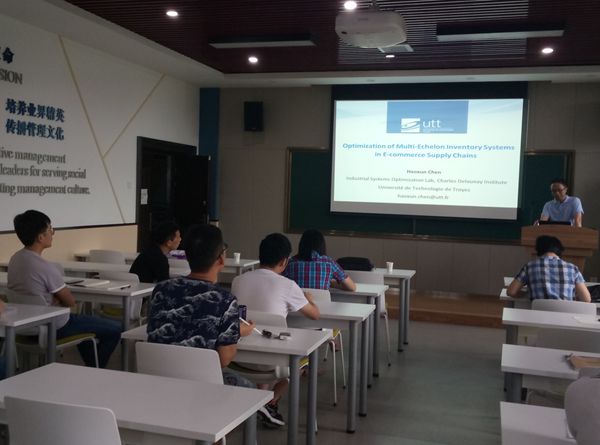 在提问环节,参会的同学积极发言,陈教授也为大家一一解答。多位研究生对多级库存中需求预测如何影响库存管理及目前库存管理中的补货策略以及未来的发展方向等问题表现出了浓厚的兴趣。
