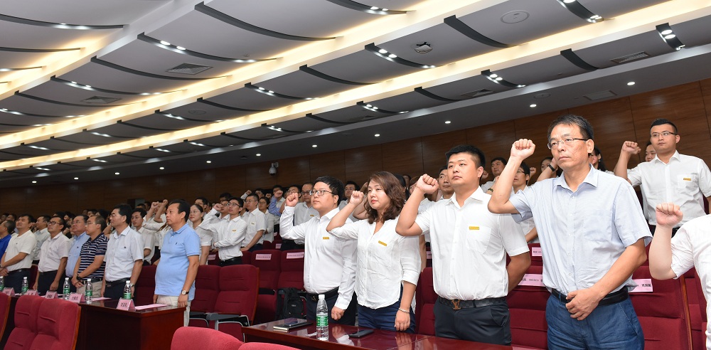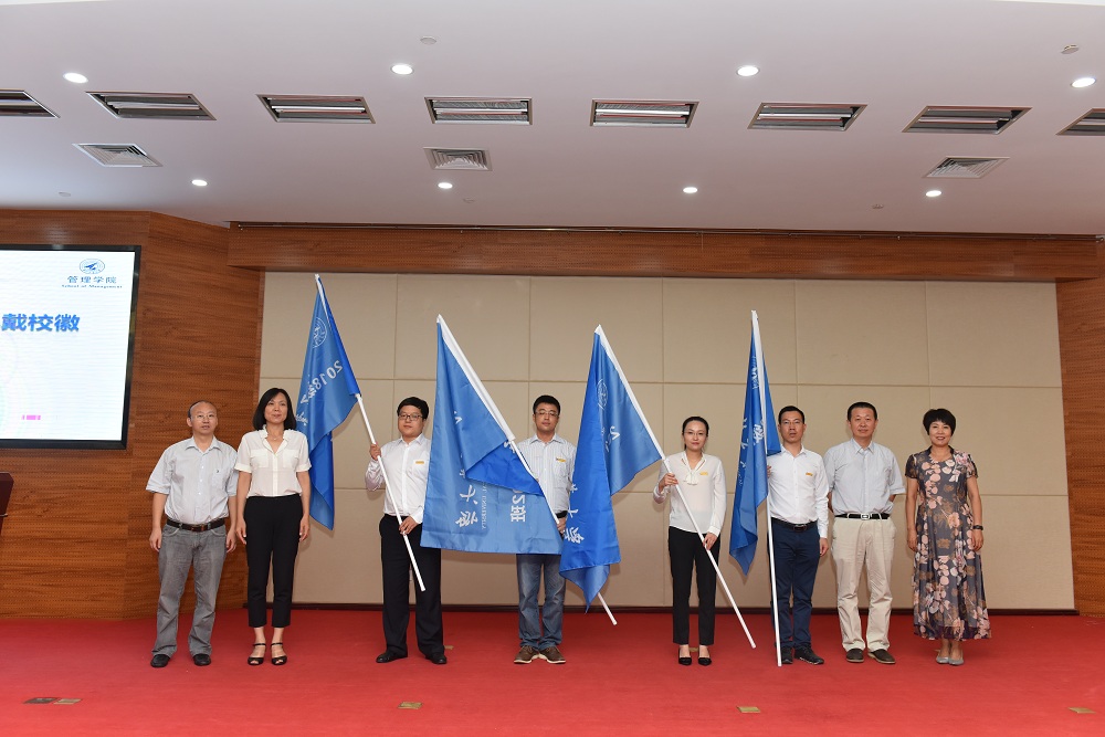 接着,李小聪书记、张翠仙副书记、郭云涛副院长、孙若妮副主任分别为2018级MBA1201班、2018级MBA1202班、2018级MEM1201班和2018级陕西MBA班四名新生代表佩戴校徽并授予班旗,新生代表梁志能同学带领全体新生宣誓,同学们心中的归属感和责任感悠然而生。