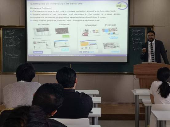 的师生去马德里理工大学做学术交流。随后,Lemus副教授以苹果、Facebook、Skype等实例为背景,引出了服务创新理论。他指出服务创新是企业价值共创的过程,包括价值活动、价值网络和行为主体三个维度。然后,Lemus副教授以西班牙、意大利多家咨询公司为背景,提出了服务型企业如何实施创新这一研究问题。随后,他着重讲解了案例研究的理论推演与模型构建过程,并且展示了数据编码与数据分析步骤。接下来,Lemus副教授详细介绍了企业实施服务创新步骤、所需能力,并指出政府、用户、技术、员工、其他行为者对该过程的影响。最后,在服务创新方面,Lemus副教授指出了未来值得研究的几个方向。
