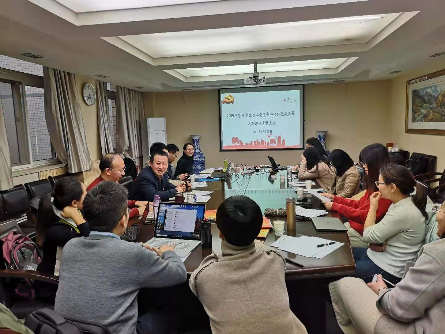 党委召开了2019年度教职工党支部书记抓党建工作述职评议大会。学院班子成员、工会副主席、系主任及系主任助理代表、教师代表共计11人担任评委。会议由学院党委书记李小聪主持。