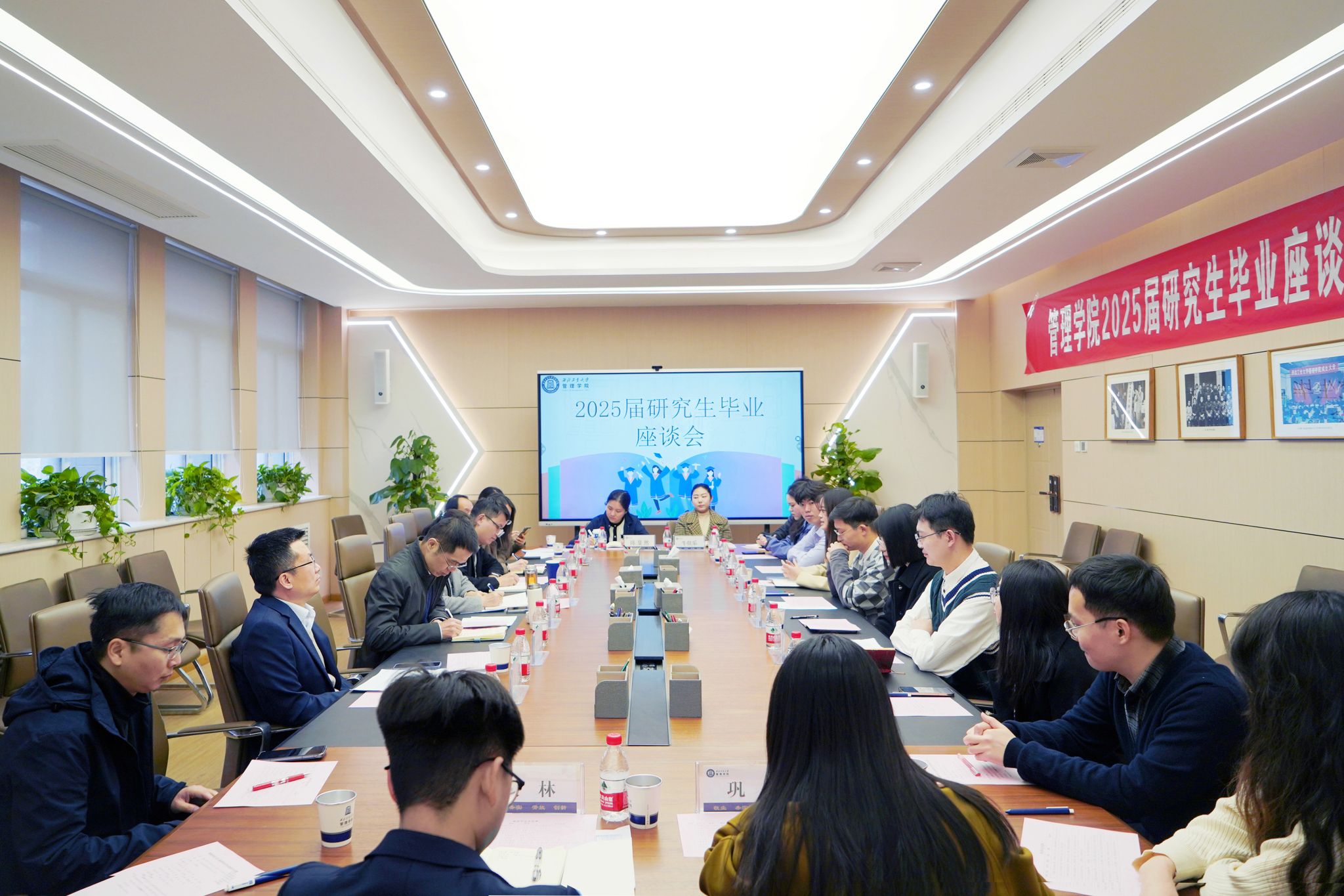 顺利举行2025届研究生毕业座谈会。院长车阿大、党委书记张爽、副院长贾明、党委副书记王海啸,各系系主任,学工干部,研究生教学秘书,研究生代表齐聚一堂,以座谈会形式畅谈成长与收获。会议由王海啸主持。