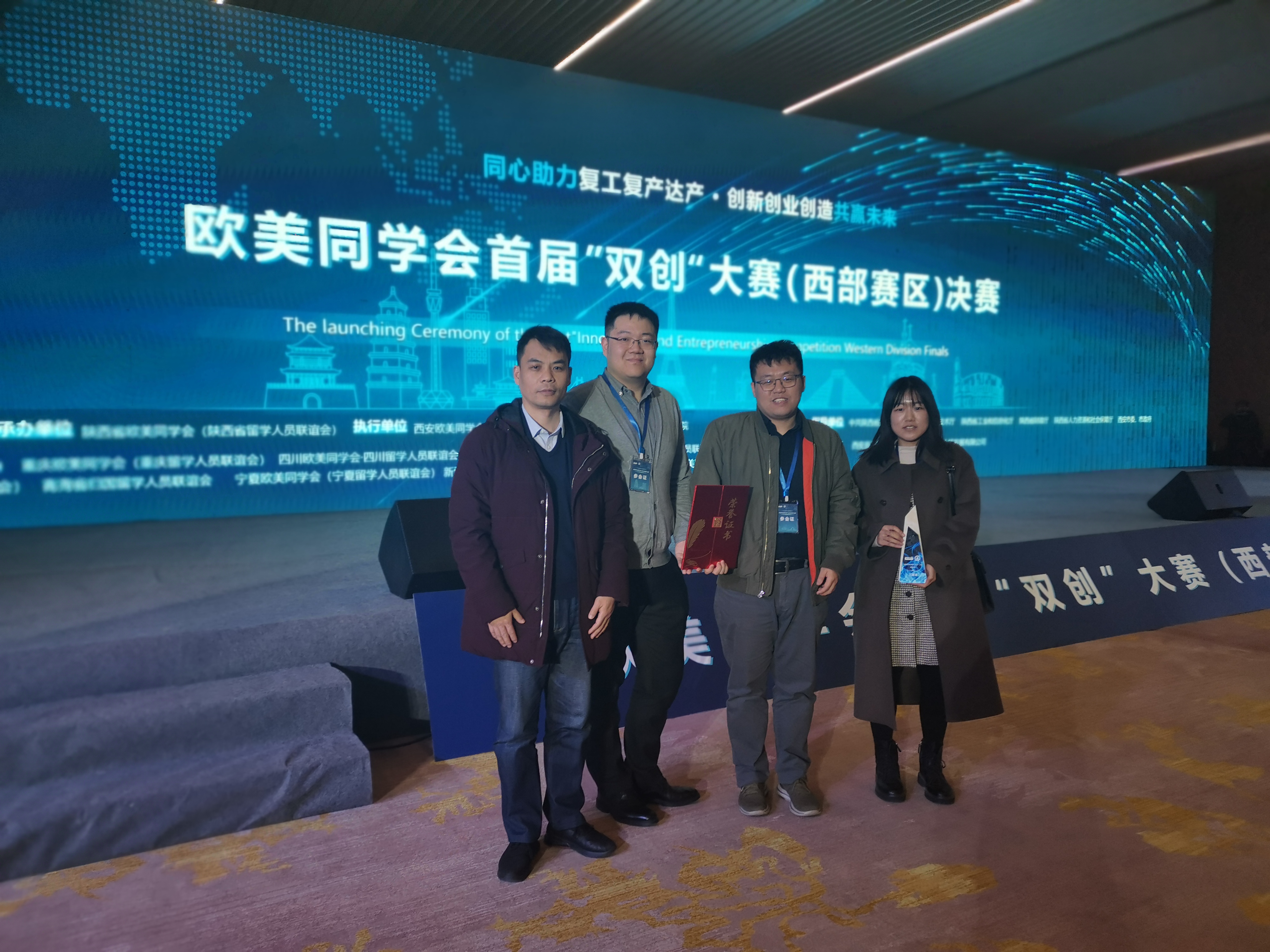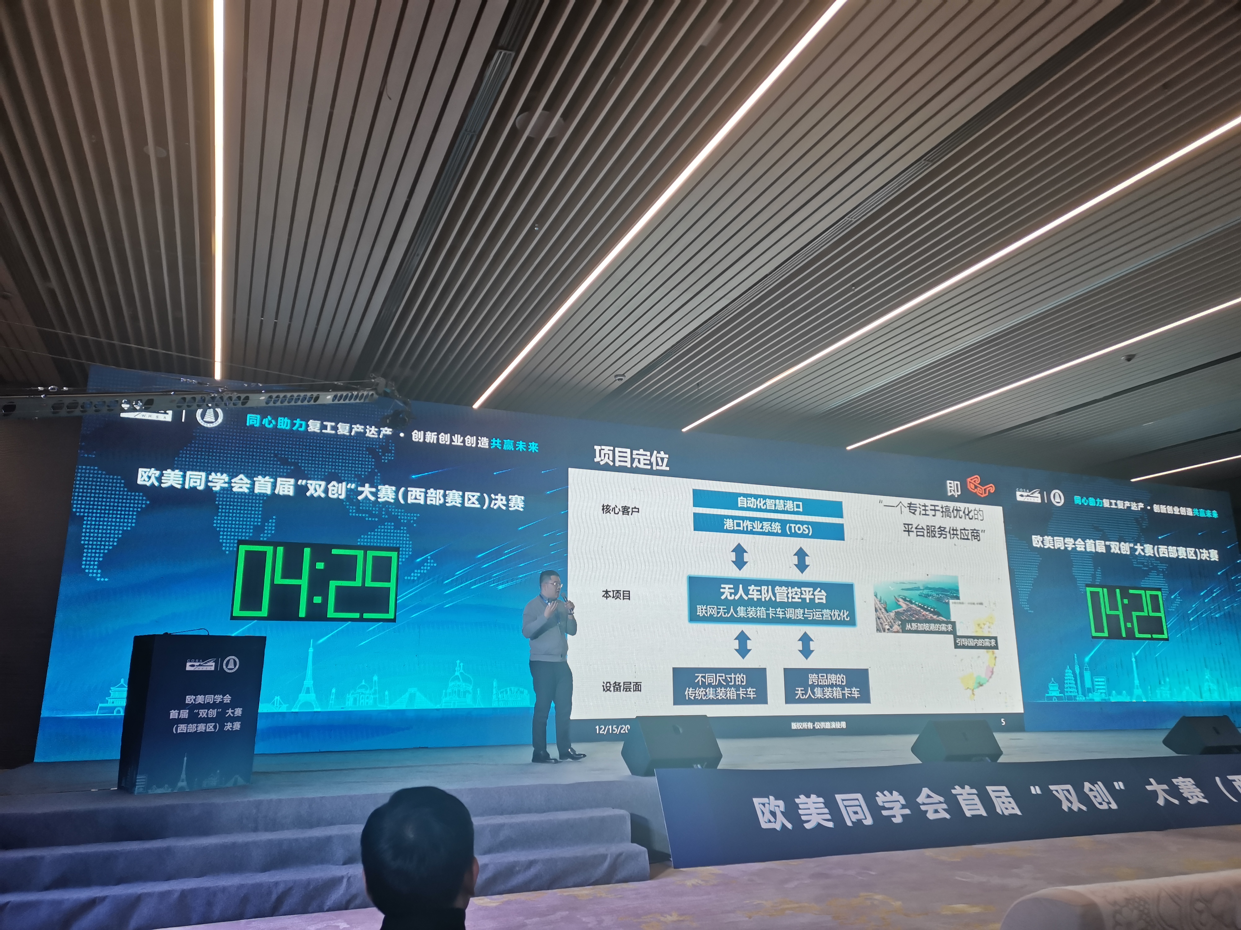 周琛淏教授从港口运营的行业现状、未来港口的实际需求、项目定位、核心技术、团队情况、项目进展情况、盈利模式、退出模式以及未来规划等方面对参赛项目进行汇报,向评委阐述了项目的核心竞争力,即基于5G三层通信框架和集中分布式混合协议的无人车队管控平台。经过激烈角逐,该项目荣获欧美同学会首届“双创”大赛(西部赛区)三等奖。