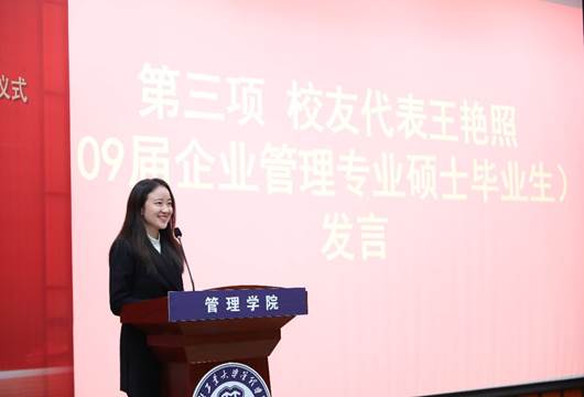 2009届企业管理专业硕士毕业生王艳照作为校友代表,对广大毕业生寄语:用积极乐观的心态正确面对挫折;坚持学习,即使走出校门也应当保持学习的态度和努力的状态;要有务实、担当、创新的职业精神;做一个心怀感恩的人,树立小我与大我。