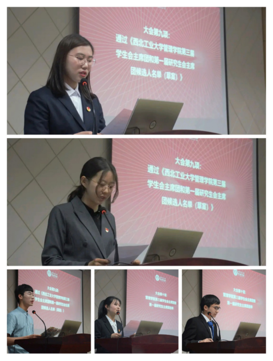 第三届学生会主席团和第一届研究生会主席团候选人成员名单。候选人依次进行了自我介绍,讲述了自己竞选主席团成员的原因以及优势。
