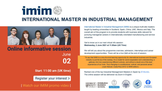 参加IMIM工业管理国际硕士联合培养项目信息交流会,此次会议于Zoom进行,学院院长助理邵婧参加了此次会议。会议由来自西班牙马德里理工大学的Isaac Lemus-Aguilar教授主持。