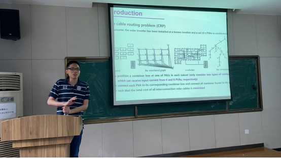 接下来,罗老师介绍了自己所著的光伏路线设计的论文。将光伏路线问题转换为带容量限制的最小生成树问题。用列生成的方法求解。其中最核心的难点是解决定价层问题,利用动态规划考虑所有可能的拓展方式,利用双向搜索的方式和一些剪枝算法加速算法的进程。算法设计好后介绍了一些算例实验和计算结果。算法的效果比人工排布成本节约17%。