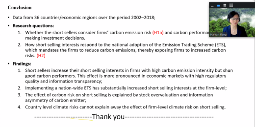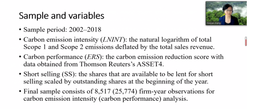 首先,苏坤老师对Haiyan Jiang副教授进行了简要介绍。随后,Haiyan Jiang副教授以“Do investors take climates into consideration while making investment decisions?” 问题启发在座师生对气候风险与投资者的投资决策之间的关系进行思考。此次讲座中,Haiyan Jiang副教授从气候风险的研究背景出发,深入探讨气候风险(碳排放强度和碳绩效)与卖空活动之间的关系,以及外生事件ETS对上述两者关系的影响。除此之外,Haiyan Jiang副教授进一步讨论企业的气候风险对卖空活动的具体机制。