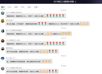 每位学生家长都在急切的等待着学生回家。学院辅导员在做好学生工作的同时,及时将学校的离校安排告知家长,赢得家长对学校的认可和赞誉。家长们通过辅导员在家长群里的发照片和视频,看到深夜一辆辆开进校园的车队、看到凌晨老师们陪同学生一起在乘车点候车、看到学校为同学们发放的爱心卡片、看到同学们拿着“工大,我爱你”的标牌拍照时的开心笑容,被深深的打动了,“为西工大点赞”“为是西工大的学子而骄傲”!