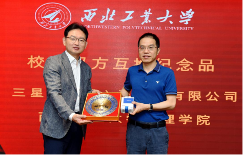 车阿大院长、三星(中国)半导体有限公司柳然雄副总裁作为校企双方代表互换纪念品,期待三星半导体与开车漫画