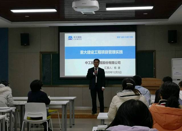 随后,杨康重点讲授了理论知识要与实践工作中紧密结合。杨康提出目标导向、底线思维、抓核心抓关键的思维方式,以华为公司为例,教导同学们“艰难困苦,玉汝于成”的道理永远不会过时,并结合工作经历总结了海外工程重点关注要点。接下来,杨康老师就重大工程项目中的目标管理、组织管理、范围管理和风险管理进行详细介绍。