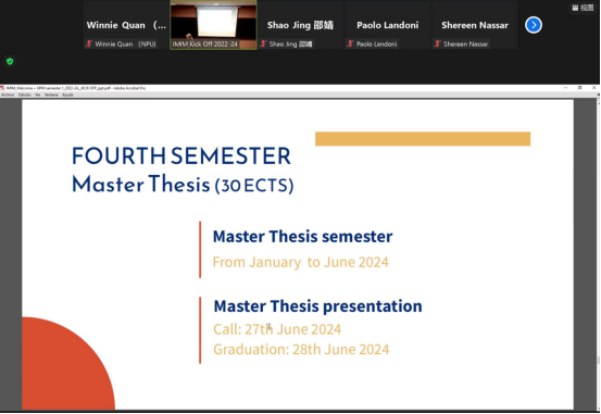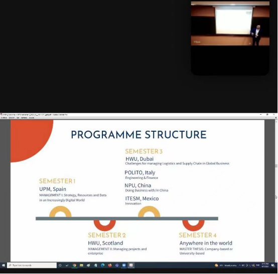 院长助理邵婧副教授及外事秘书权梦甜子受邀在线参加,同期参会的还有来自英国赫瑞瓦特大学、意大利都灵理工大学、墨西哥蒙特雷科技大学的项目负责人以及即将入学的新生。会议由马德里理工大学工业工程学院的Isaac Lemus教授主持。