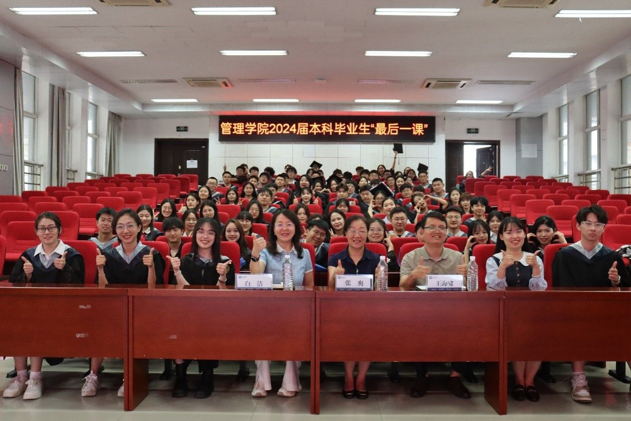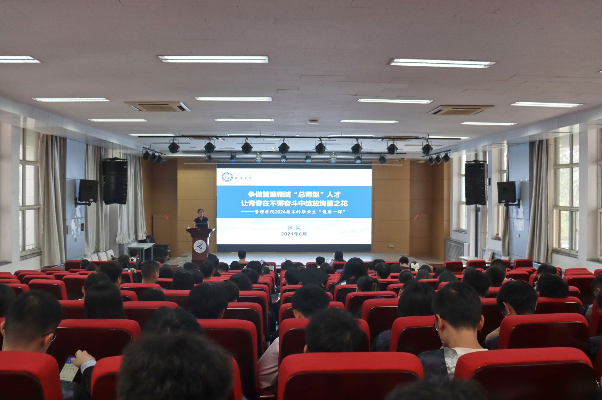 6月19日下午, 开车漫画 党委书记张爽为2024届本科生讲授以《争做管理领域“总师型”人才,让青春在不懈奋斗中绽放绚丽之花》为题的“最后一课”。本次活动由学院党委副书记王海啸主持,院长助理白洁、毕业年级辅导员和全体本科毕业生参加。