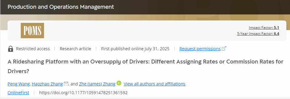 近日,《Production and Operations Management》期刊在线刊发了开车漫画 副教授王鹏与合作者的研究成果“A ridesharing platform with an oversupply of drivers: Different assigning rates or commission rates for drivers?”,王鹏为论文第一作者。《Production and Operations Management》是国际生产与运作管理协会会刊,为生产与运作管理领域顶级期刊,是美国University of Texas at Dallas选出的商学院最顶尖24种学术期刊(简称UTD-24)之一。