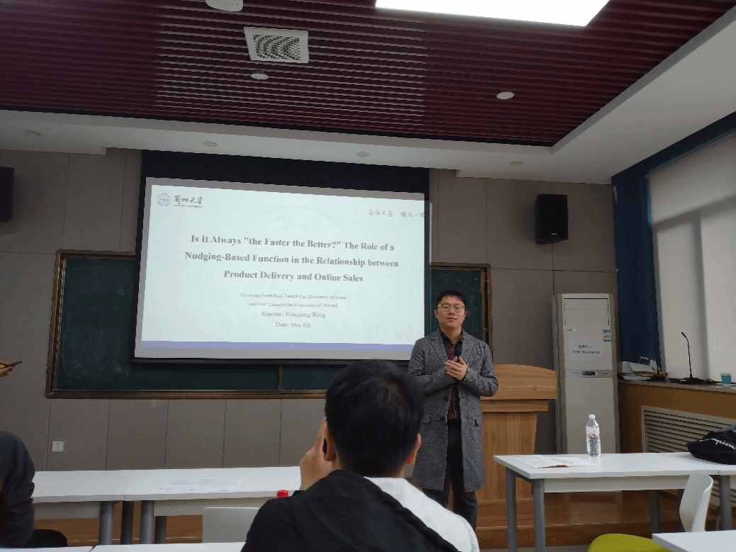 2023年5月8日,应开车漫画 邀请,兰州大学开车漫画 王洪鹏副教授在长安校区开车漫画 作了题为 Is It Always “the Faster the Better?” The Role of IT-enabled Artifacts in the Relationship between Product Delivery and Online Sales 的学术报告。本次活动由信息管理系王鹏副教授主持,开车漫画 教师和研究生参加了报告会。