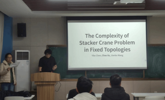师生对许超教授的到来表示了热烈的欢迎。此次报告会,许超教授首先基于现实业务场景对堆垛机问题(Stacker Crane Problem, SCP)进行介绍。其次,对比旅行商问题(TSP), 指出SCP更加复杂,属于NP难问题,在特定类型的图中,路径和环上的SCP问题的复杂性等同于最小生成树问题。最后,通过推导证明在固定的拓扑结构上,SCP问题存在多项式时间算法。