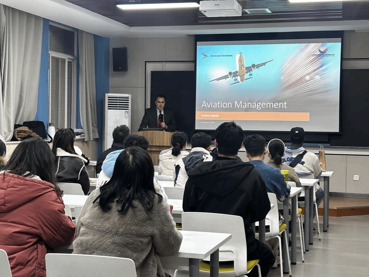 在互动环节,Andrew Madar耐心回答了学生提出的问题,例如在碳减排的压力下,中国商飞如何进行可持续的发展等。他的专业知识和见解为参会师生提供了深刻的指导。会议最后,邵婧副教授对本次报告会作出总结。Andrew Madar专家的深入讲解和耐心答疑,赢得了师生们的广泛赞誉,不仅为学生们介绍了航空管理这一新的领域,也激发了大家对航空工业的浓厚兴趣。