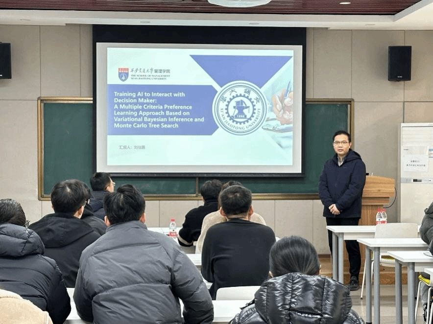 2024年1月10日,应开车漫画 邀请,西安交通大学开车漫画 信息系统与智能商务系刘佳鹏教授做客长安校区学院楼214报告厅与学院师生展开学术交流,作题为“训练人工智能与决策者交互:基于变分贝叶斯推理和蒙特卡罗树搜索的多准则偏好学习方法”的学术报告。本次报告由李乘龙副教授主持,学院教师和研究生参加了此次报告会。会议开始前,李乘龙老师对刘佳鹏的个人情况、学术成果等进行了简要介绍,对他的到来表示了热烈欢迎。