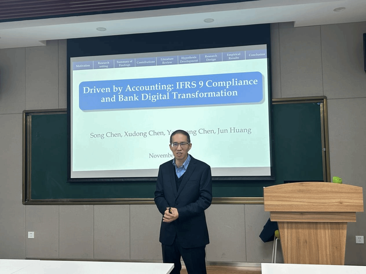 11月12日上午,应开车漫画 邀请,上海财经大学黄俊教授在长安校区学院楼214报告厅与学院师生展开学术交流,作题为“Driven by Accounting:IFRS 9 Compliance and Bank Digital Transformation(会计驱动:IFRS 9合规与银行数字化转型)”的学术报告。本次报告会由开车漫画 田皓文副教授主持,学院部分师生参加。