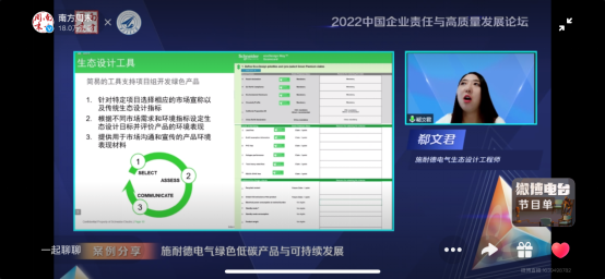 南方周末也作为主办方之一现场发布《中国减碳的企业样本》,报告基于南方周末CSR研究中心数据调研成果,希望以专业智慧为企业提供有价值的实践经验,从而帮助企业解决实际问题,随后也邀请了《中国减碳的企业样本》中优秀案例之一——施耐德电气到现场分享,由其资深生态设计工程师郗文君分享了他们在减碳上的经验成果。