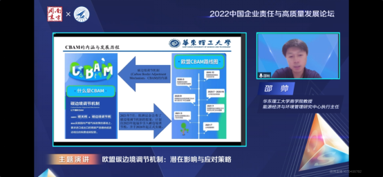 下午,华东理工大学商学院教授,能源经济与环境管理研究中心执行主任邵帅教授为我们带来来自国际视角的观察——《欧盟碳边境调节机制:潜在影响与应对策略》,为“双碳”目标的实现讨论提供了全新的视角,从产能过剩治理领域出发给我们带来了一个高质量参考;中国电子节能技术协会全生命周期绿色管理专委会主任王洪涛老师,为我们带来《企业全生命周期碳中和评价指标体系(通则)研究》介绍,同时这也是南方周末中国企业社会责任研究中心与中国电子节能技术协会全生命周期绿色管理专委会联合发起的“企业全生命周期碳中和调研与评价”项目成果之一;CDP中国副总监李蜚为我们带来《中国企业环境信息披露现状与展望》,向我们展示了在碳中和大势汹涌澎湃的当下,国内各企业在环境信息披露方面的成果。