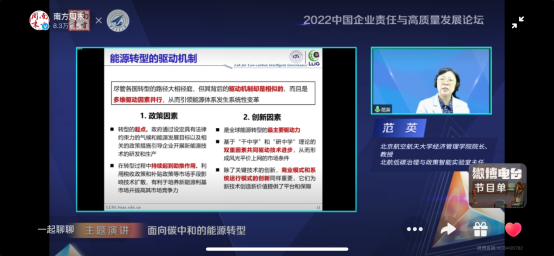 院长、北航低碳治理与政策智能实验室主任范英带来题为《面向碳中和的能源转型》的主题演讲,让我们能够看到碳中和愿景目标下,各类清洁能源的广阔市场空间;西北大学地质学系教授,二氧化碳捕集与封存技术(CCS)国家地方联合工程研究中心执行主任马劲风为大家报告《碳捕集与封存是煤基能源为主体的陕西实现碳达峰碳中和的关键》,分享了二氧化碳捕集与封存技术对减少二氧化碳排入大气的有效利用、还有通过大数据的分析总结,助力碳达峰碳中和等等,内容精彩纷呈,学术性干货满满;国网陕西电力科技数字化部副主任吴健分享《创新践行环境使命,彰显央企责任担当》,详细阐述央企如何履行社会责任,助力绿色发展。