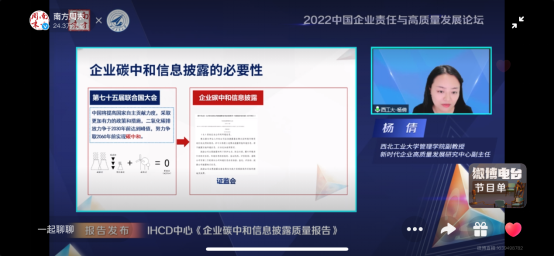 副教授,新时代企业高质量发展研究中心副主任杨倩发布《企业碳中和信息披露质量报告》,是国内首次从利益相关者的角度出发,对沪深300指数上市公司做出的碳信息披露质量评价。这两份报告也是本次论坛的重点发布内容,具体报告内容随后会发布在公众后续推送中,欢迎大家持续关注。