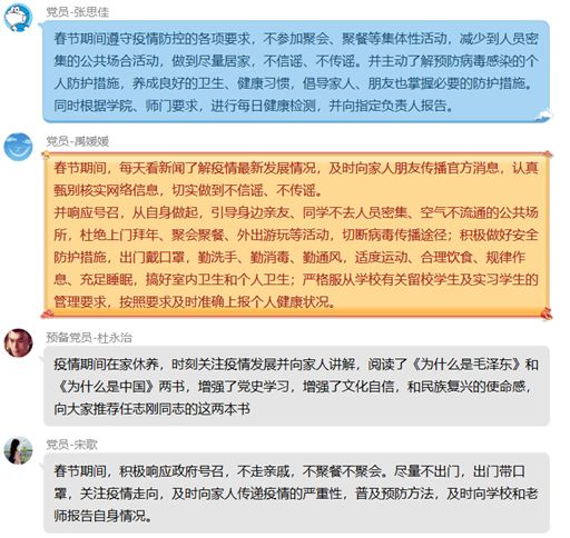 2月11日、14日支部同志们统一学习 “张定宇”等人的先进事迹,各位党员同志线上发表自己的学习感悟,虽然我们不能和医生一样战斗在第一线救死扶伤从,研制对抗病毒的疫苗,但是我们应该尽己所能,号召周围的群众做好防控工作,面对谣言能够做到“不信谣,不传谣”;关注相关新闻报道,了解疫情防控措施和情况;注意个人卫生,服从统一安排。