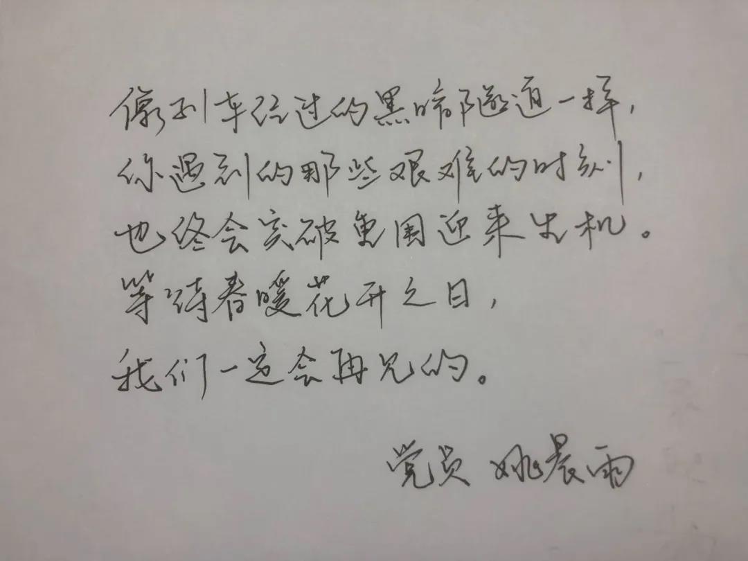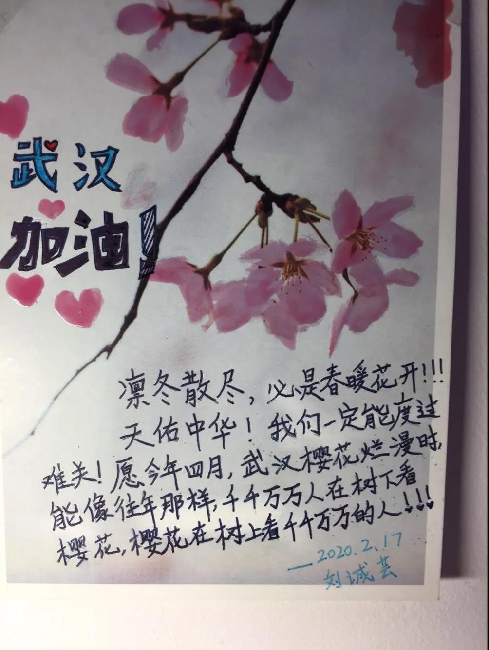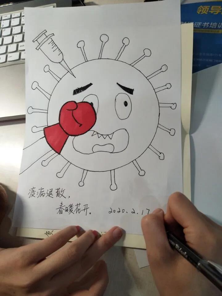 2月16日,支部又展开了“声援接力活动”,以绘画、文字、视频等形式表达对一线医护人员、湖北人民的祝福。虽然身有隔但心很近,但是我们一定能够迈过这道坎,打赢疫情阻击战。