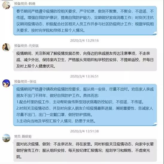 2月4日共同学习了《教育部致全国大学生的一封信》后,举行了线上交流分享的主题党日活动,各位党员交流了疫情期间自己的学习、锻炼、媒体声援等等所有相关的行为。虽然疫情阻碍我们各项外出活动,但各位党员同志保持乐观积极的心态,不断充实自我,并积极向周围亲属传递正能量,正确控制防范疫情,调整心态。