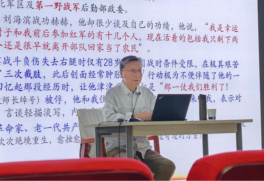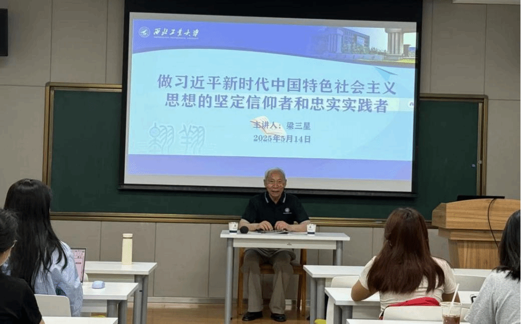 退休教授梁三星以《做习近平新时代中国特色社会主义思想的坚定信仰者和忠实实践者》为题,回顾了中国共产党的百年奋斗征程,并激励工大学子要以习近平新时代中国特色社会主义思想为指引,做坚定信仰者、忠实实践者。