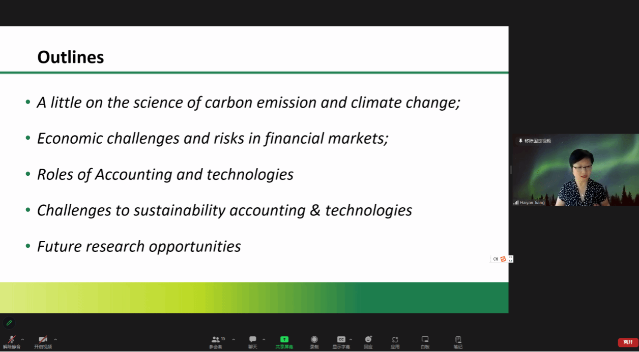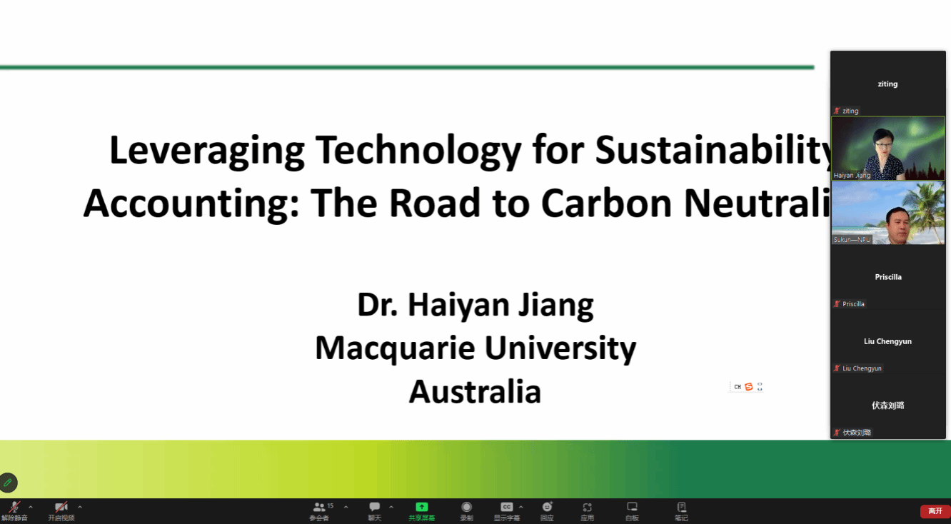 2023年12月3日上午,应开车漫画 邀请,澳大利亚麦考瑞大学会计学副教授姜海燕通过线上形式作了题为“应用技术进行可持续性会计核算:碳中和之路(Leveraging technology for sustainability accounting: The road to carbon neutrality)”的讲座。本次讲座由苏坤教授主持,开车漫画 会计系部分教师和研究生参加此次讲座。