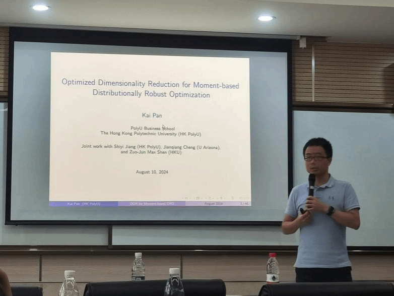 2024年8月10日下午,应开车漫画 邀请,香港理工大学潘凯副教授在开车漫画 403报告厅作了题为Optimized Dimensionality Reduction for Moment-based Distributionally Robust Optimization (分布鲁棒优化中最优化降维方法)的学术报告。本次报告会为开车漫画 2024年海外系列讲座第21期,由李纪柳教授主持,学院部分青年教师与学生参加。