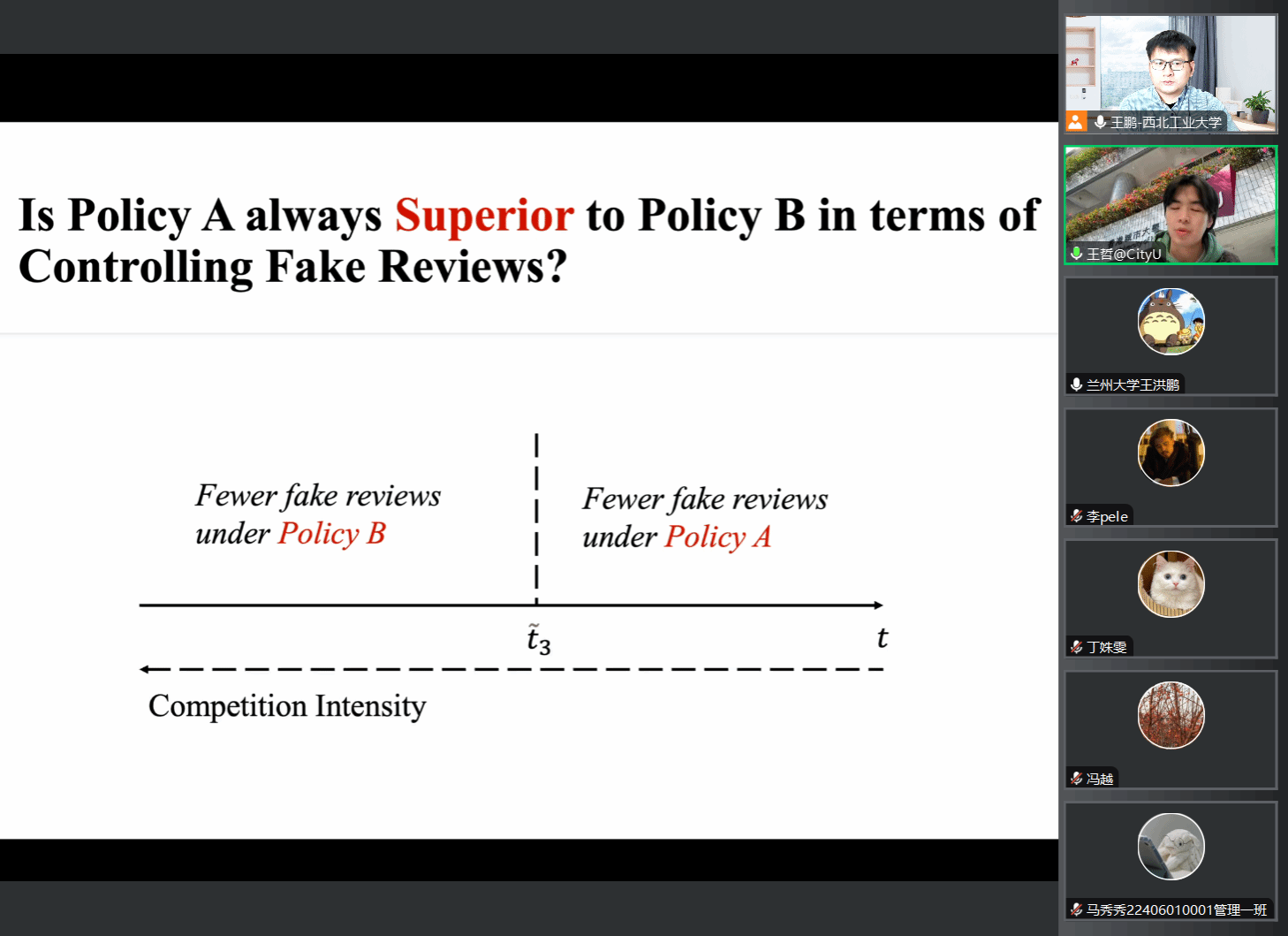 师生作题为《评论展示政策如何影响平台打击虚假评论的动机:一个博弈论的视角》的学术讲座,本次讲座为开车漫画