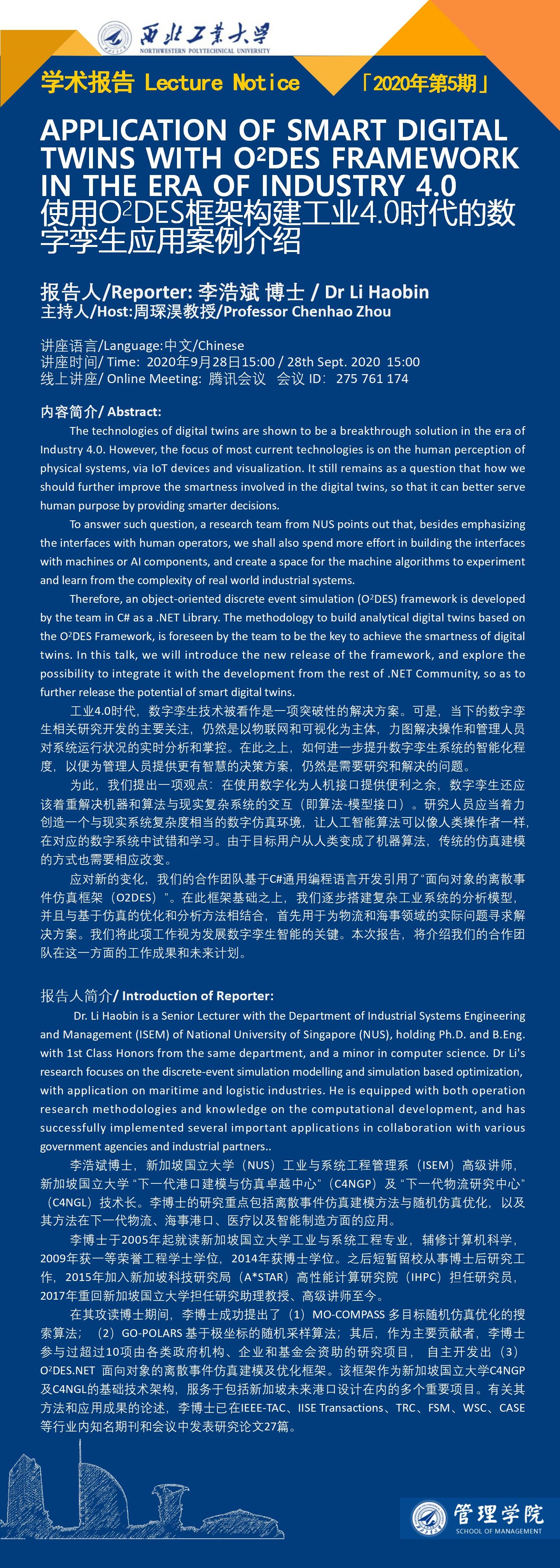 [学术报告]APPLICATION OF SMART DIGITAL TWINS WITH O2DES FRAMEWORK IN THE ERA OF INDUSTRY 4.0