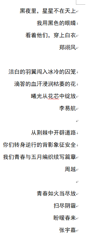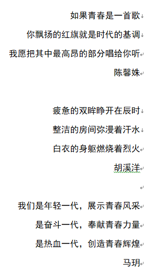 为了学习青年榜样,团支书周越组织同学们自行搜集相关新闻,描述医护人员的一天。通过搜集新闻,互相分享,大家对医护人员付出的努力有了更加清晰的感受与认知。同学们描述起来很轻松的几句文字,其实是所有医护人员每天都在努力奋战的日子。她们之中的很多也和我们一样是青年人,她们已经担起重任,守护起我们的生活。在了解医护人员的一天之后,同学们以“青春心向党,建功新时代”为主题作三行诗,纷纷展示了不俗的文采。