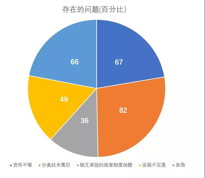针对这样的差异化表现,问卷中对市民的“问题征集”可以探究到一定的原因。除了前文提到的垃圾分类的宣传不够、对市民未形成良好的知识普及外,垃圾分类的设施不完善、市民对分类技术持怀疑态度以及目前缺少一定的制度约束和保障,也是造成这种现象的较大影响因素。