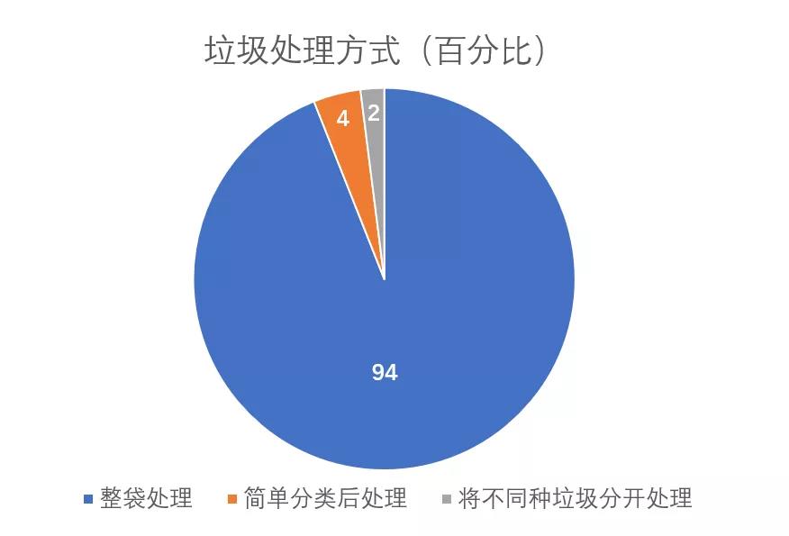 在对市民的垃圾处理方式的调查中,进行“分类”行动的市民仅为6%,94%市民都是“整包处理”,这与市民对垃圾分类知识的了解程度形成明显的数据差异,由此可见大多数市民“知识上有一定了解”但行动上还是“整包处理”,未进行分类。