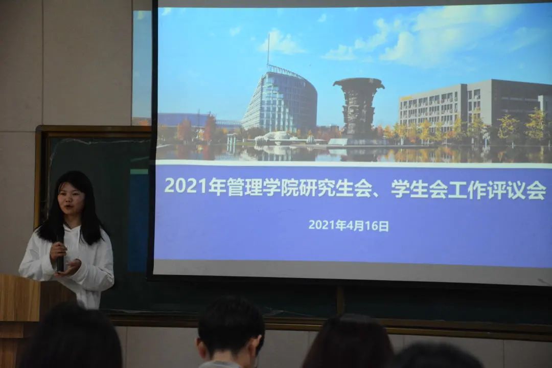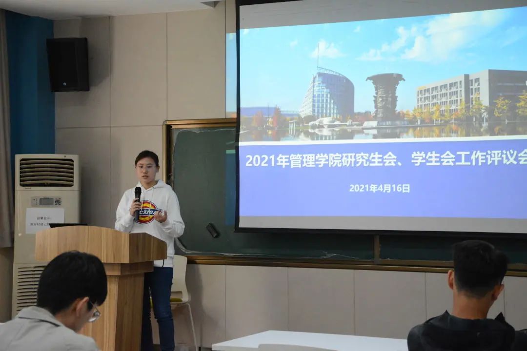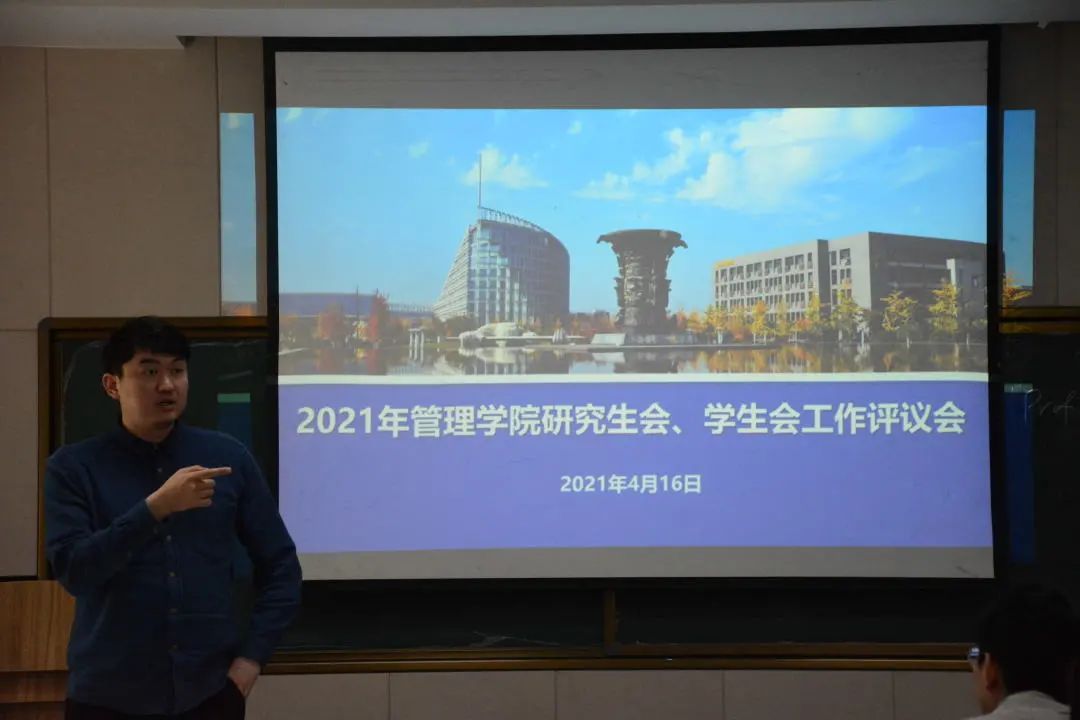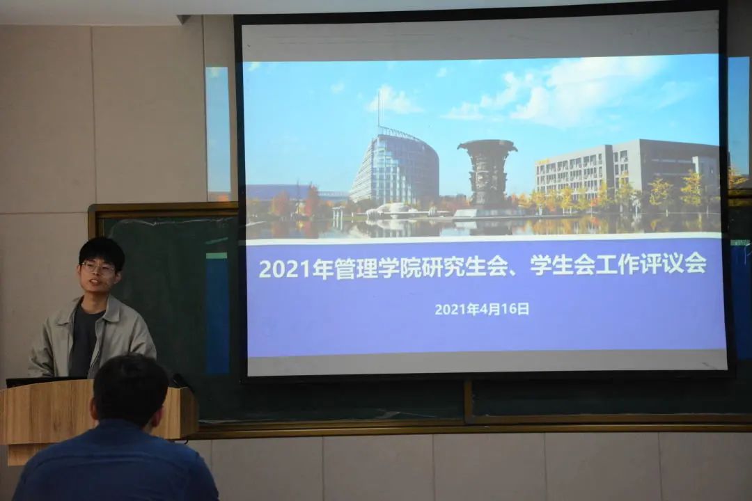 研究生会主席团成员李国庆发言:“研究生会目前设有办公室、就业实践部、科学技术协会以及文体协会四个部门,定期召开全体大会、主席团会议,组织团建活动。上一年度,举办思想引领类、科研服务类、文体活动类、就业服务类活动共计21项。我们会做好机构精简,加强学院研究生队伍建设,争取学习资料和活动文档线上化,方便同学们有需自取。”