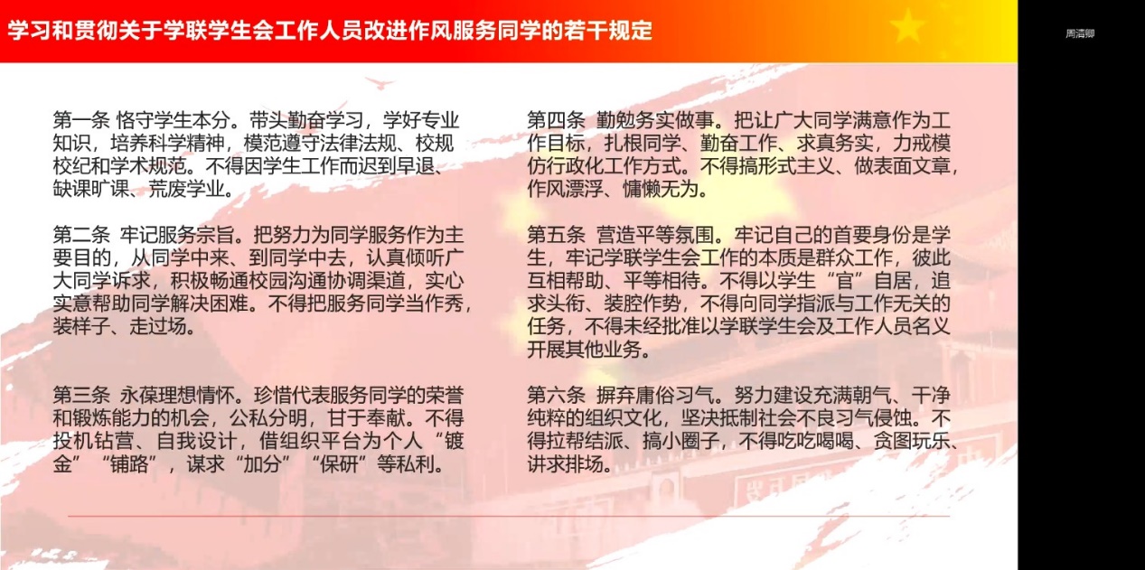 学生会以线上会议形式举办学习和贯彻关于学联学生会工作人员改进作风服务同学的若干规定会议,本次会议由开车漫画