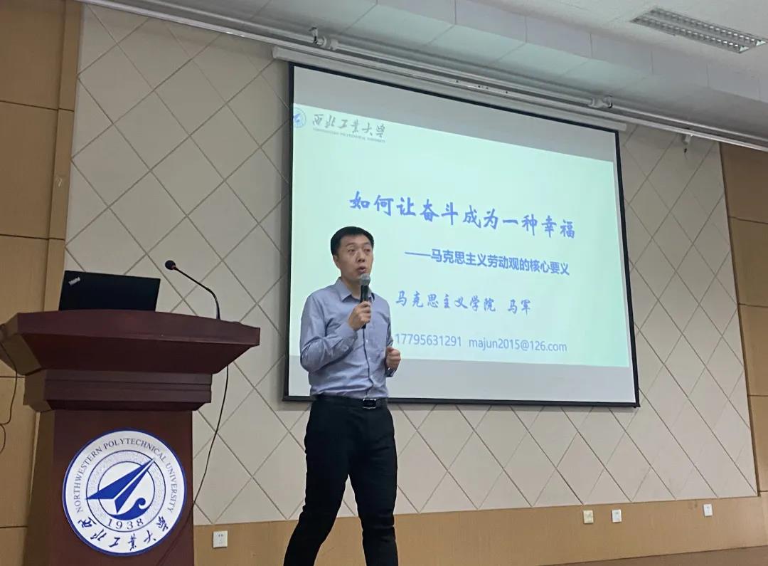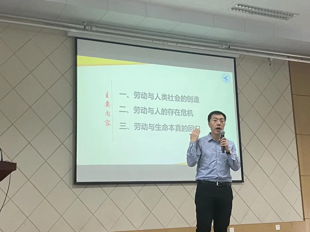 报告厅进行。本次理论课程的主题是“如何让奋斗成为一种幸福——马克思主义劳动观的核心要义”。本次课程由马克思主义学院马军老师主讲。