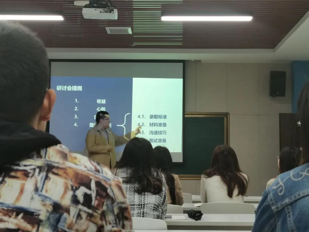 邀请周琛淏教授在210会议室召开了出国经验交流会。周教授从“收益、心酸、值不值、该怎么走”四个方面向我们讲述了关于出国的相关事宜,分享了他的出国经验。