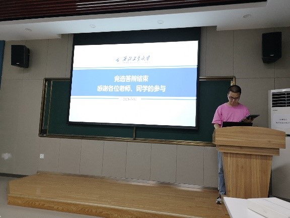 那依力老师首先对参辩同学表示了肯定,总结了每位同学答辩的优点;其次提出了答辩中出现的一些问题,如提交的个人材料不规范、答辩内容未涉及团委现存问题及解决方案等;最后那依力老师对日后的团委工作进行了展望。