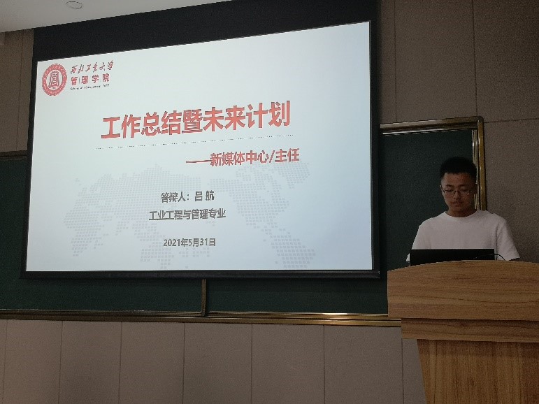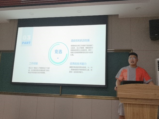 第一个环节是团委新媒体中心主任竞选答辩。首先是吕航同学出场,他着重介绍了自己对团委新媒体中心的认识及未来的工作规划。