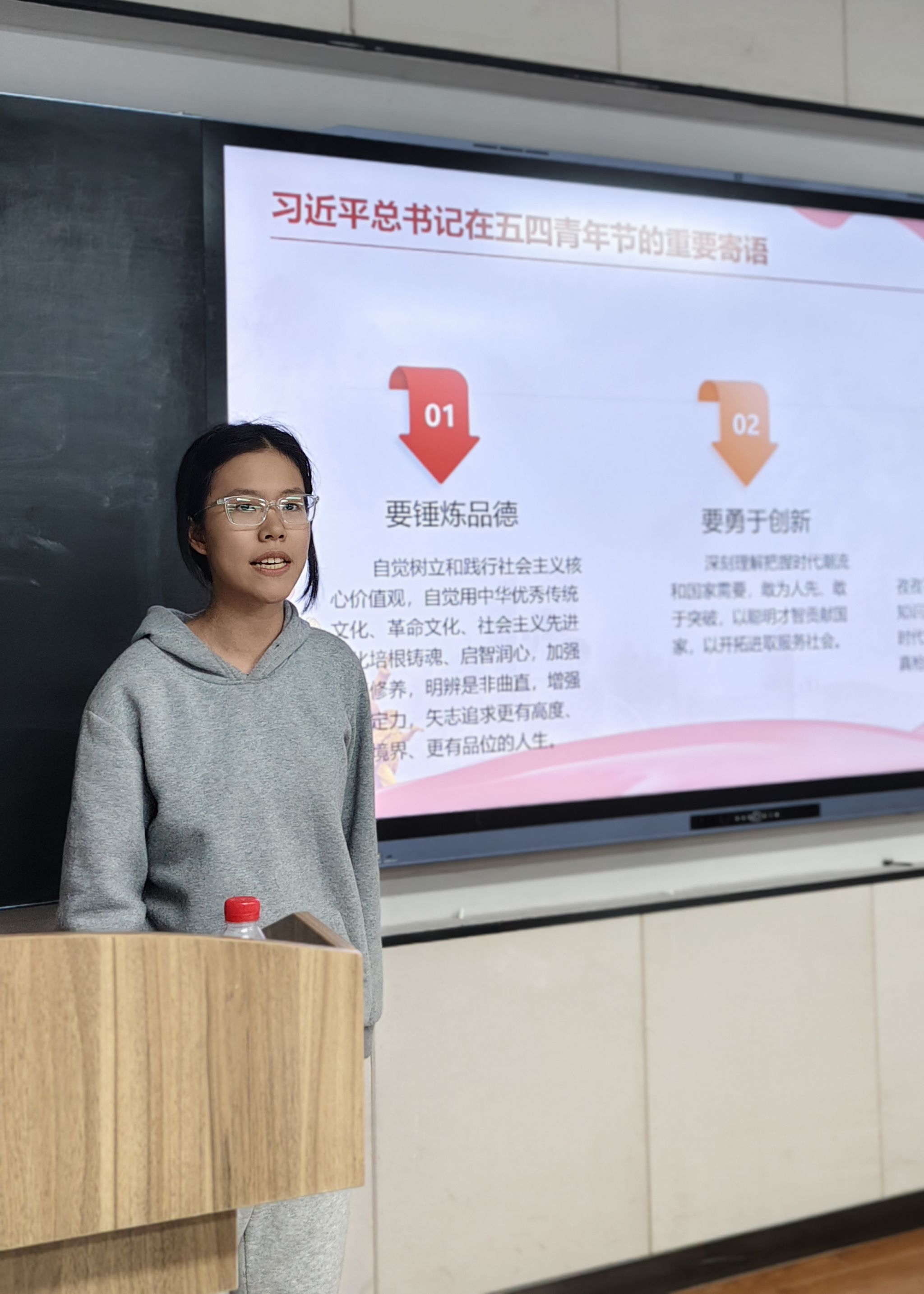 班会伊始,班长关名孜带领全班同学学习习近平总书记2025年五四青年节寄语,聚焦“坚定理想信念、厚植家国情怀、练就过硬本领、发扬奋斗精神”的期望,结合支教志愿者扎根边疆的鲜活案例,呼吁同学们筑牢专业根基、厚植家国情怀,以行动践使命,不负青春韶华。