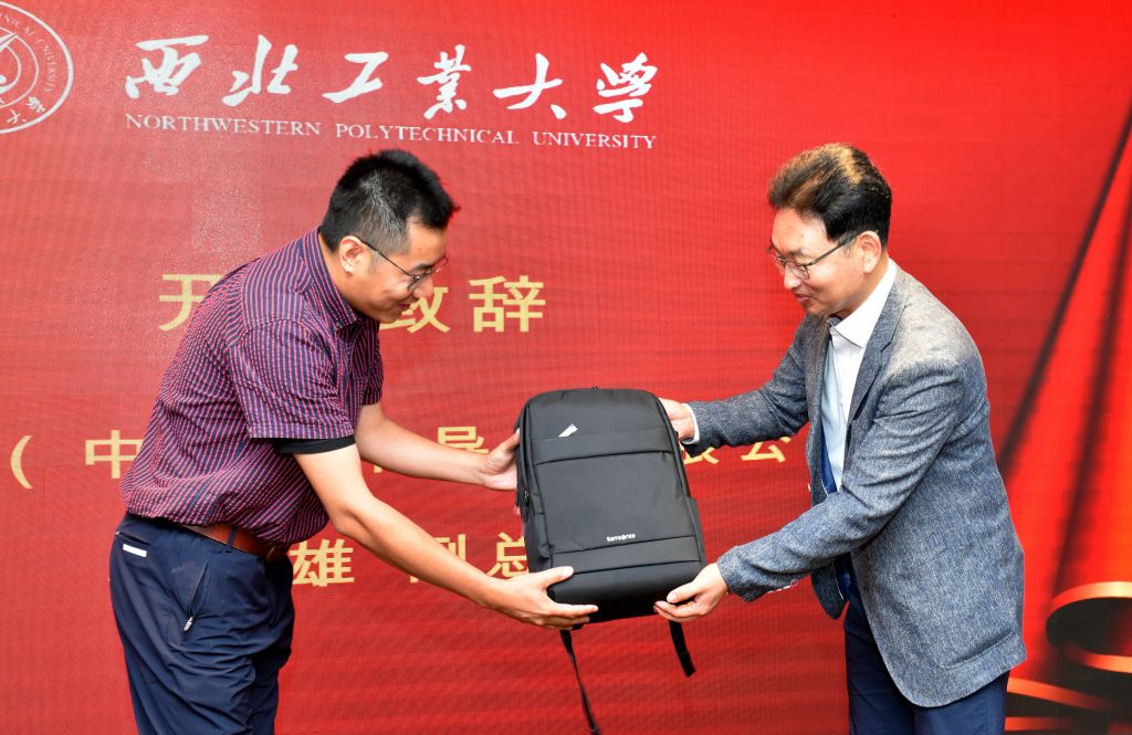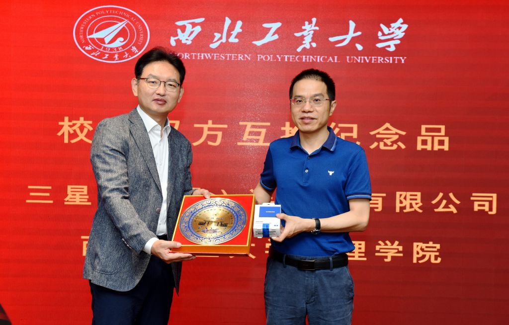 车阿大院长、三星(中国)半导体有限公司柳然雄副总裁作为校企双方代表互换纪念品,期待三星半导体与开车漫画