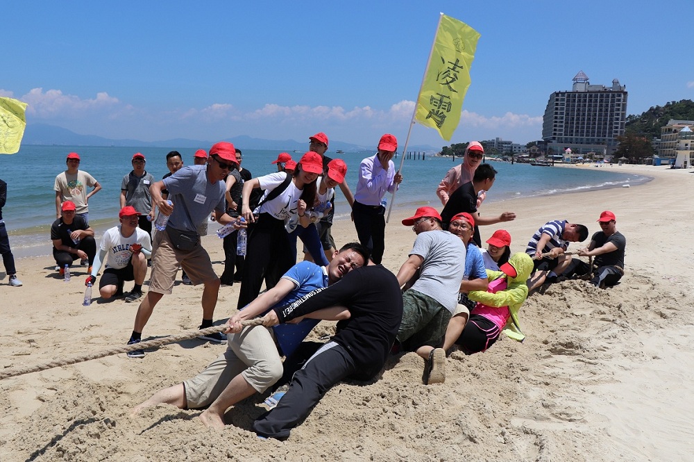 在拓展训练中,涉及了破冰团建、跳出真我、多米诺骨牌、水上大闯关、沙滩拔河和共绘蓝图等多个项目。学员们在教练的组织下,分成“先锋队”、“尖刀队”、“凌霄队”、“利剑队”、“西瓜队”、“天鹰队”、“猛虎队”、“飞龙队”八支队伍,他们起队名、制队徽、立队训、唱队歌、塑队型,打破陌生,相互协作,快速融入大集体中。