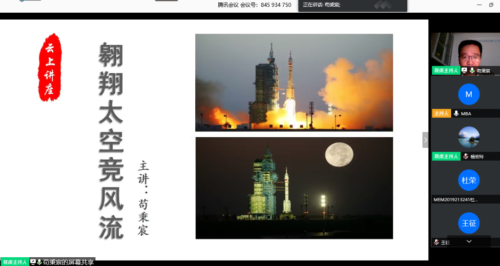 专业学位研究生做了《翱翔太空竞风流---中国载人航天事业的亲历与思考》专题讲座。讲座由MBA/MEM教育中心主任杨宏玲主持,百余名学生通过腾讯会议软件在线聆听了讲座。